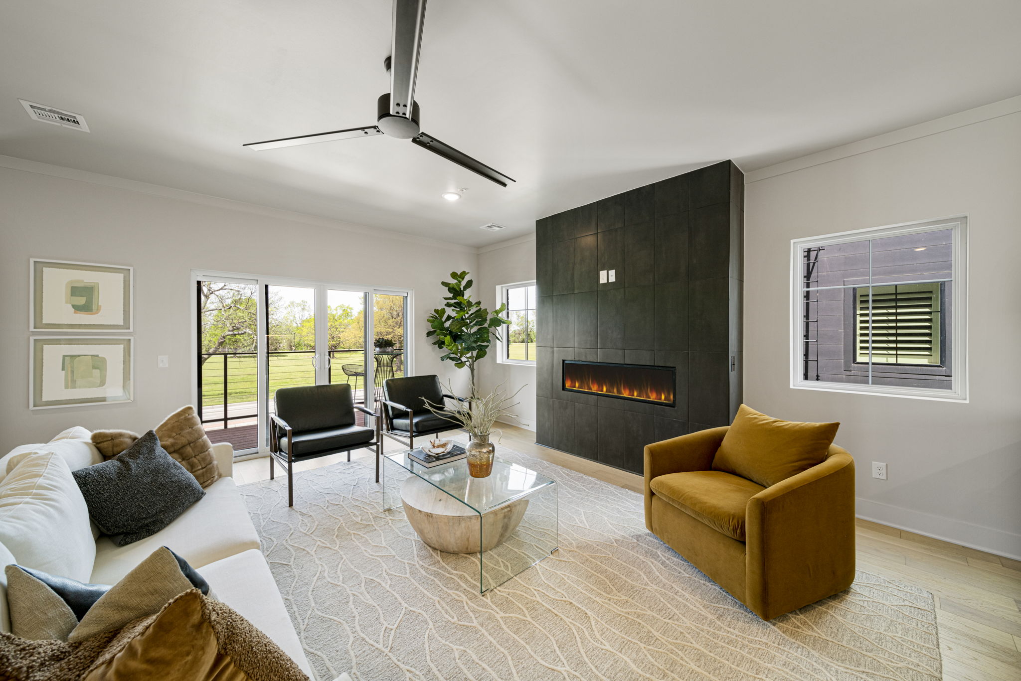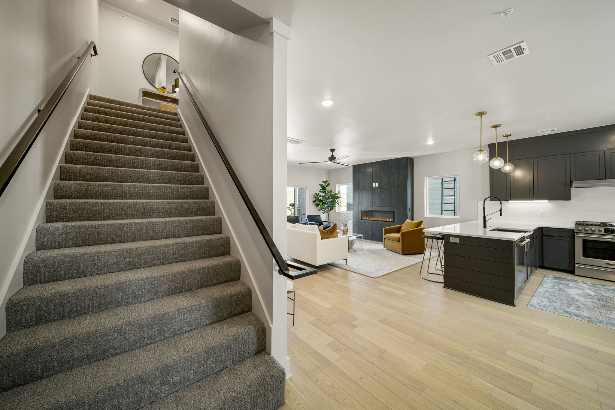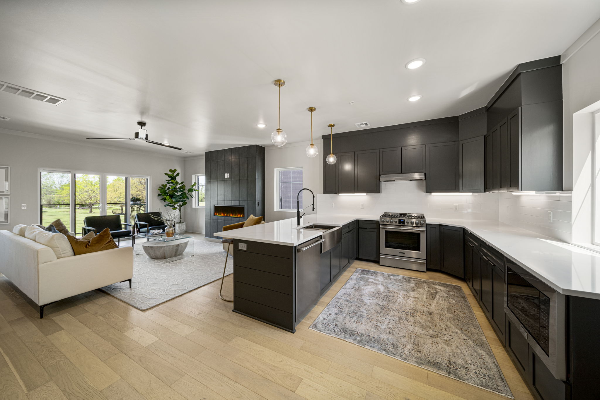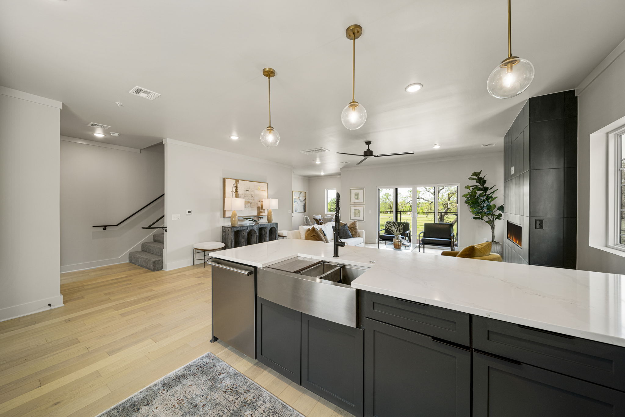 Discover modern elegance in the newly constructed Edgewater Condominiums, a boutique community featuring 18 luxurious units with 5 still available for purchase. The main level offers an open-concept design with a spacious living area, a stunning fireplace, and a chef's kitchen featuring quartz countertops, professional stainless-steel appliances, a prep sink, and island seating. A versatile office or dining nook and a stylish powder bath complete the space. Upstairs, you'll find two private master suites with luxe bathrooms, large walk-in closets, and a conveniently located laundry room. The ground level includes a spacious two-car garage with ample storage. These condos boast tall ceilings, abundant natural light, and exceptional storage throughout. Located directly across from Riverside, Edgewater Condominiums are within walking distance to Brookside, The Gathering Place, and scenic trails, offering a lifestyle perfect for work, recreation, and entertainment. Whether you're seeking a full-time residence or a lock-and-leave option for travel, these condos are designed to meet your needs. Don't miss this rare opportunity!